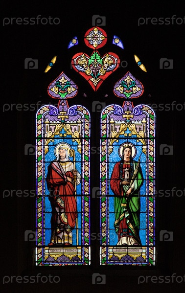 Яркий витраж с изображением религиозной фигуры и сцены молитвы внутри церкви Сен-Сакердос, Франция