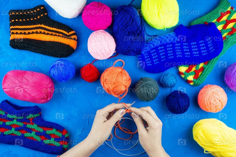 Девочка вяжет носок спицами