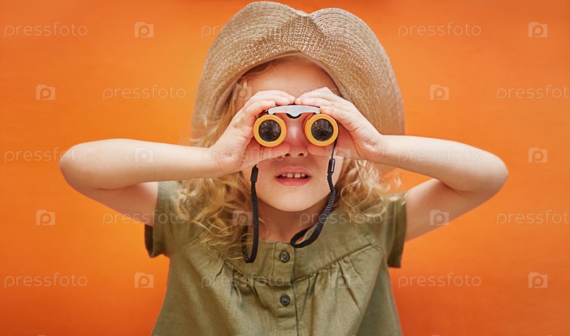 Девочка смотрит в бинокль на однотонном оранжевом фоне. Концепция отдыха и путешествий
