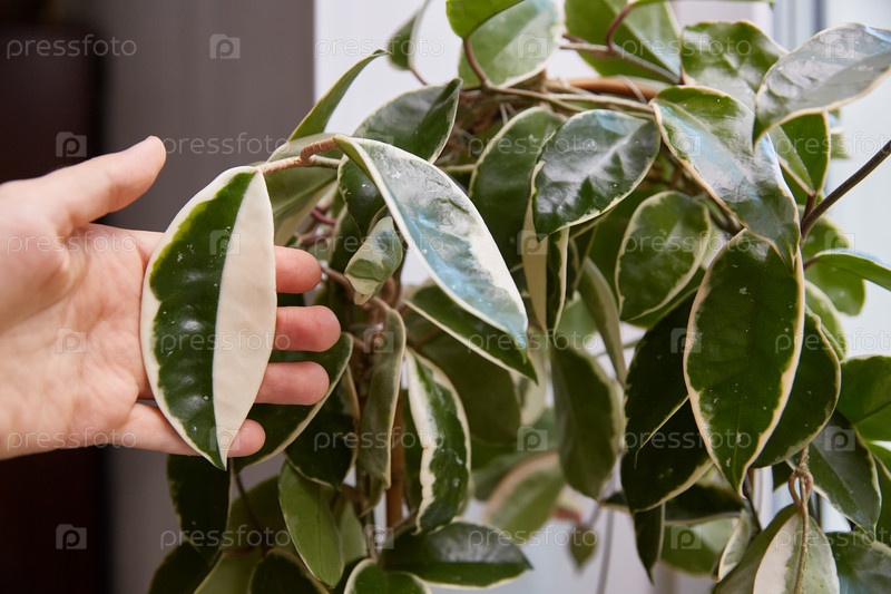 Листья Хойи Кримсон Квин крупным планом в женской руке. Листья пестрые с розовым оттенком. Домашний цветок в горшке на окне