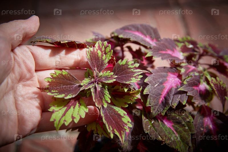 Coleus Blumei Plectranthus scutellarioides. название сорта растения Royal. листья колеуса в руке крупным планом