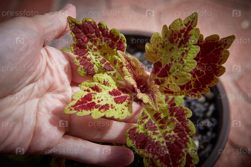 Coleus Blumei Plectranthus scutellarioides. название сорта растения Honey Pie. листья колеуса в руке крупным планом