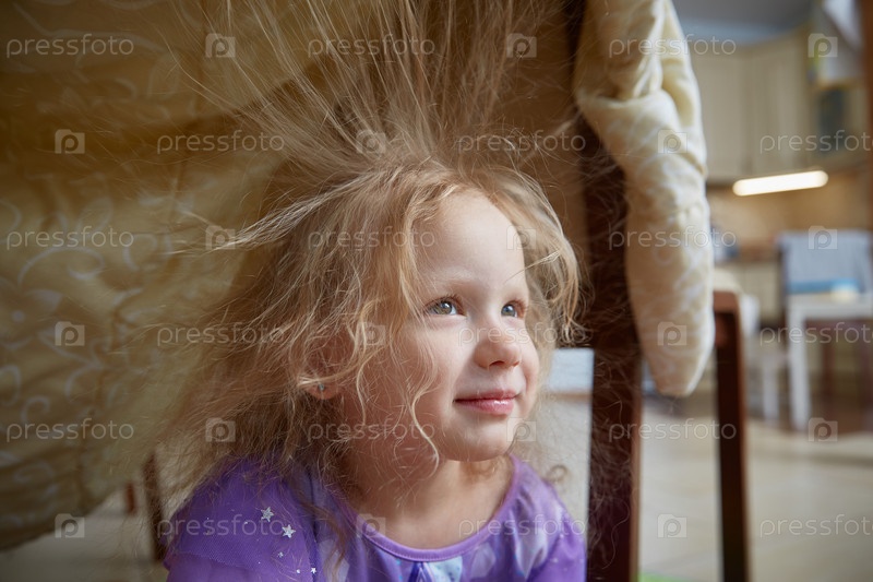 Ребенок дома играет в домике, построенном из одеяла