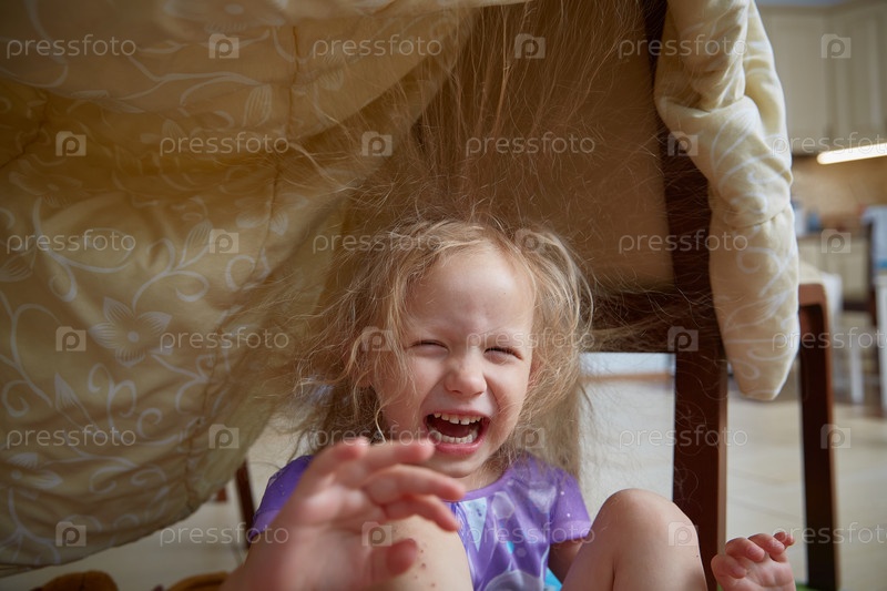 Девочка-дошкольница весело смеется, сидя под одеялом в самодельном укрытии. Наэлектризованные волосы встают дыбом
