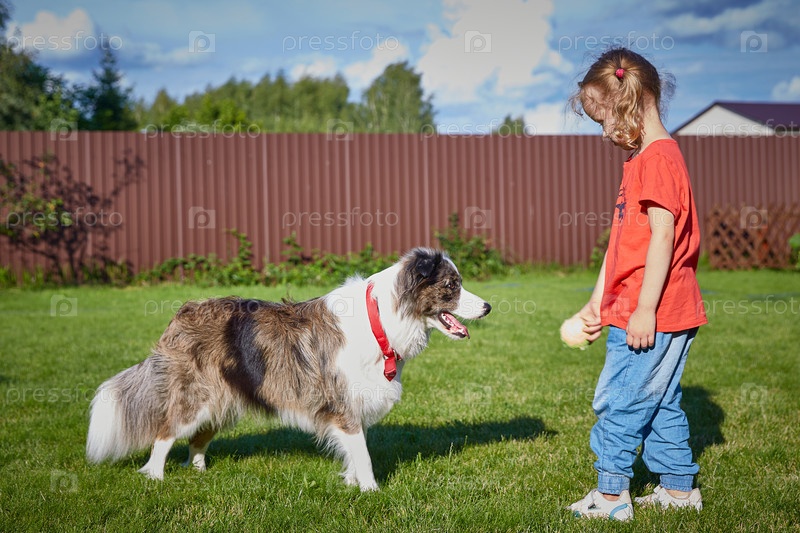 Австралийская овчарка и ребенок играют в мяч на зеленой траве солнечным летним днем