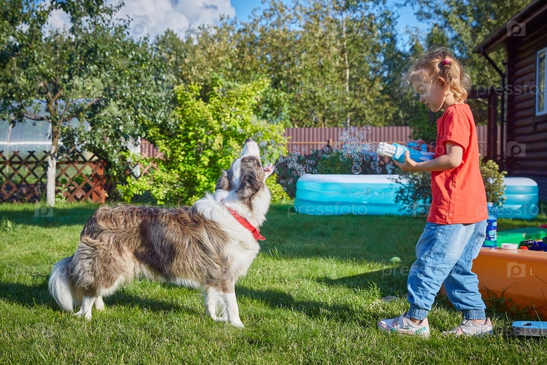 Австралийская овчарка и ребенок играют с мыльными пузырями в солнечный летний день на зеленой траве. Взаимодействие домашних животных и детей