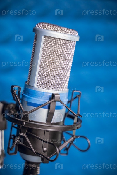 Микрофон в студии звукозаписи, крупный план, размытый фон