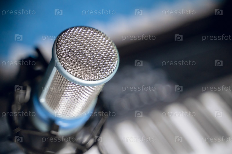 Микрофон в студии звукозаписи, крупный план, размытый фон