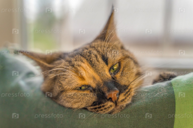 Милый молодой кот греется на солнышке на подоконнике