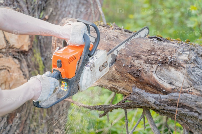Фермер пилит дерево бензопилой, выборочный фокус, фокус на переднем плане, размытый фон