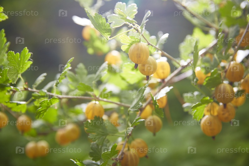 Сбор урожая. Ягоды крыжовника на ветке. Солнечный летний день