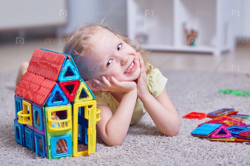 Милая кудрявая девочка рядом с домиком из магнитного конструктора дома на ковре в детской комнате