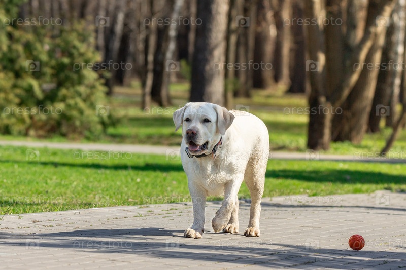 Собака породы лабрадор-ретривер с мячом