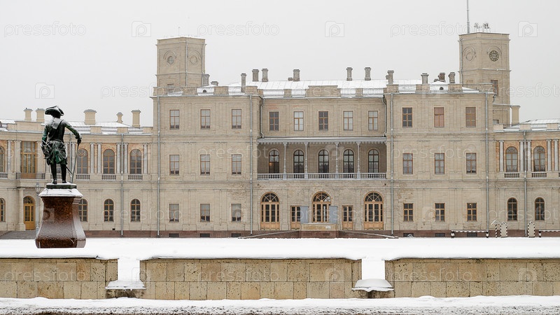 Гатчина, Ленинградская область, Россия, Большой Гатчинский дворец, главный вход в музей и памятник императору Павлу I зимой днем