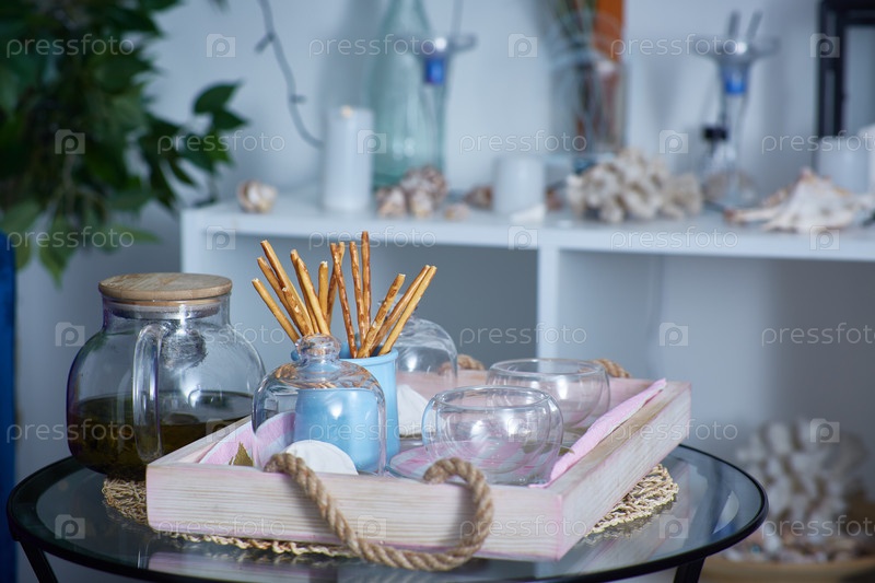 Натюрморт с зеленым чаем, стеклянными чашками и хлебными палочками