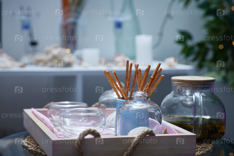 Натюрморт с зеленым чаем, стеклянными чашками и хлебными палочками