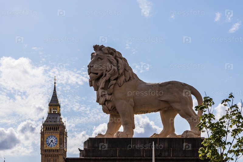 Статуя льва на Южном берегу с Биг-Беном. Потрясающий вид на Вестминстер, Лондонская архитектура