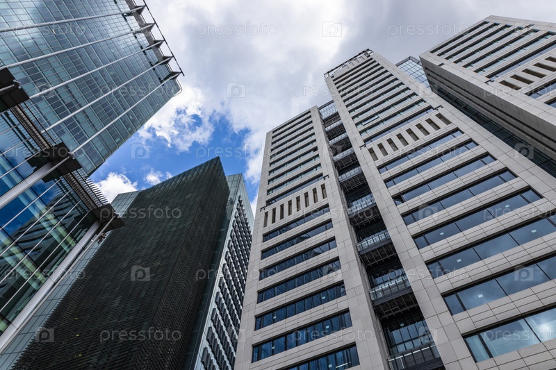Современные небоскребы со стеклянными фасадами и геометрической архитектурой в финансовом районе