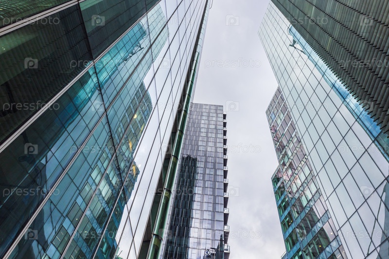 Потрясающий вид снизу на современные небоскребы с отражающими стеклянными фасадами в городе