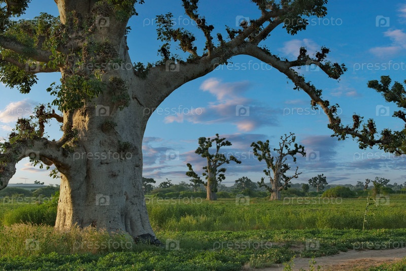 Западная Африка. Сенегал. Живописные очертания грандиозных баобабов на арахисовом поле в лучах заходящего солнца