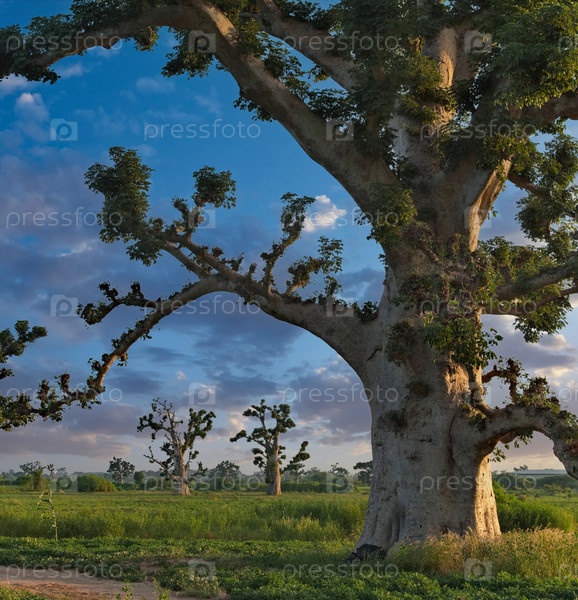 Западная Африка. Сенегал. Живописные очертания грандиозных баобабов на арахисовом поле в лучах заходящего солнца