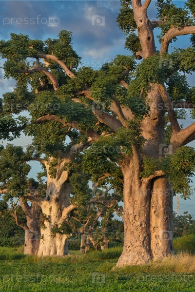 Западная Африка. Сенегал. Живописные очертания грандиозных баобабов на арахисовом поле в лучах заходящего солнца