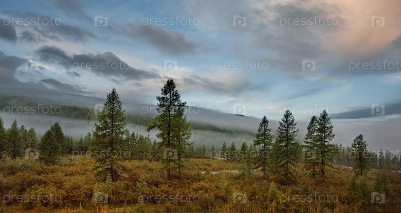Россия. Республика Бурятия. Мягкий разноцветный рассвет с туманной тайной в долине реки Ока в районе истока