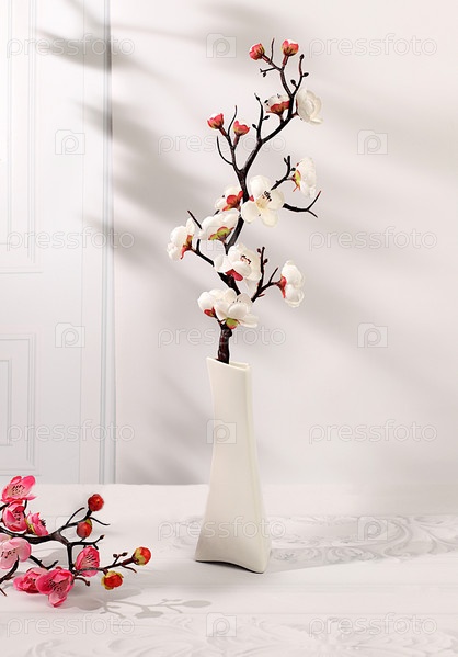 Абстрактная весенняя цветочная композиция с ветками цветущей сакуры в вазе, элегантная концепция красоты, сцена для демонстрации продукции и бизнес-концепция. Минимальная современная эстетика