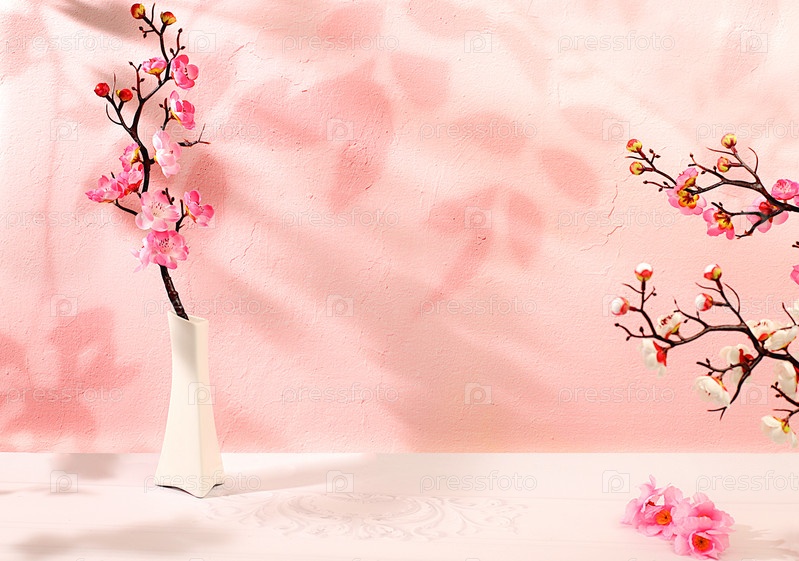 Красивая весенняя цветочная композиция с ветками цветущей сакуры, элегантная концепция красоты, сцена для демонстрации продукта и бизнес-концепции. Минимальная современная эстетика, пустой подиум премиум-класса