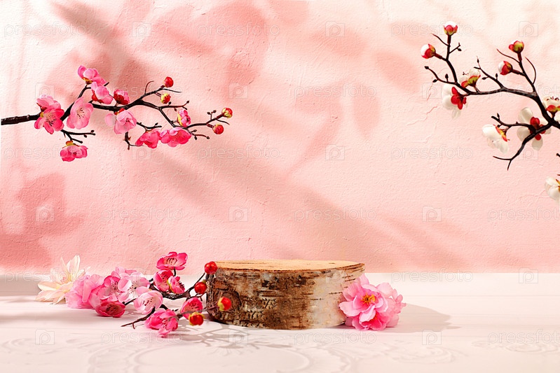 Абстрактная весенняя цветочная композиция с ветвями цветущей сакуры и пустым деревянным подиумом, элегантная концепция красоты, сцена для демонстрации продукции и бизнес-концепция. Минимальная современная эстетика