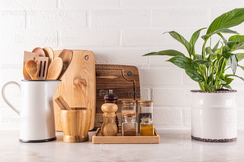 Красивый кухонный фон с зоной для хранения специй, разделочными деревянными досками, зеленым растением в шикарном комнатном горшке. Белая кирпичная стена. Вид спереди