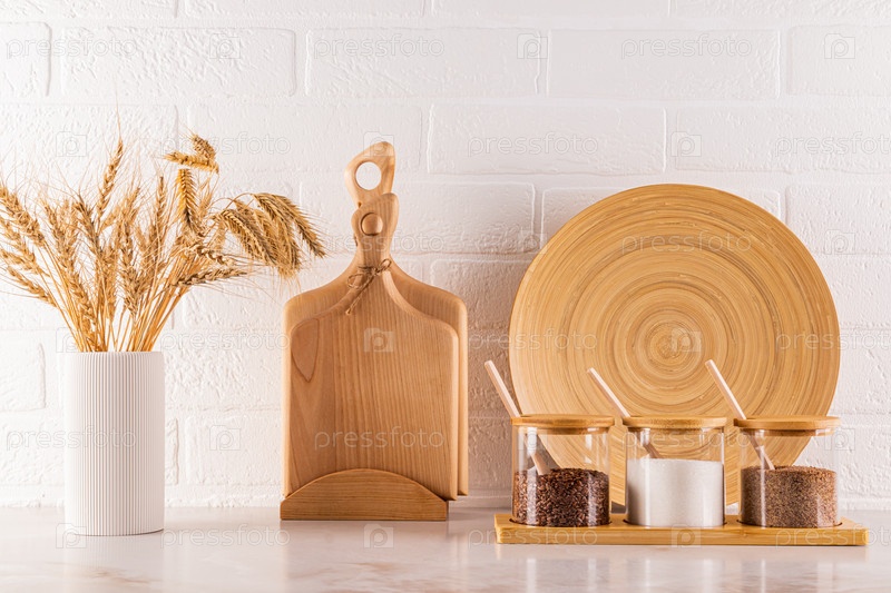 Стильный кухонный фон с современной зоной хранения специй на мраморной столешнице. Деревянные разделочные доски, бамбуковое блюдо, ваза с колосьями пшеницы. Эко-стиль