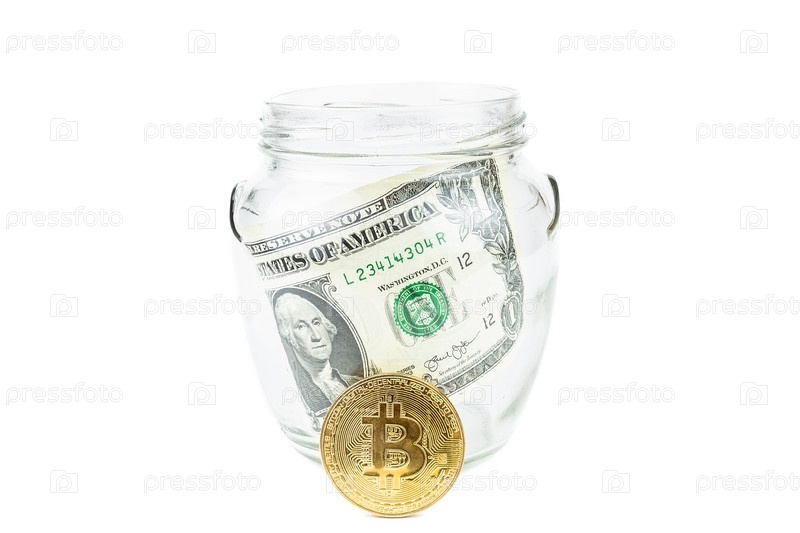 Доллар и биткойн на белом фоне