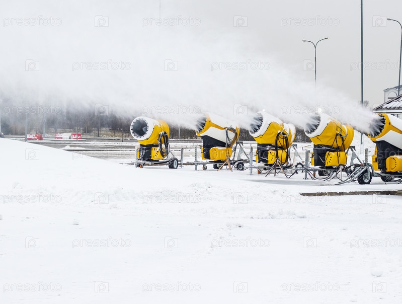 Снимок промышленного оборудования, так называемого снежного ружья или снежной пушки, которая производит искусственный снег в действии. На открытом воздухе
