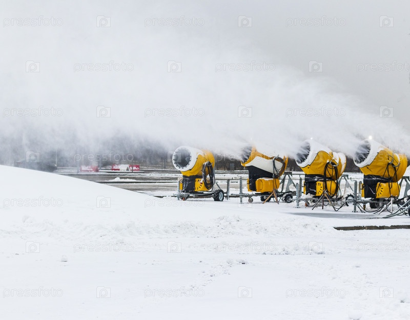 Снимок промышленного оборудования, так называемого снежного ружья или снежной пушки, которая производит искусственный снег в действии. На открытом воздухе