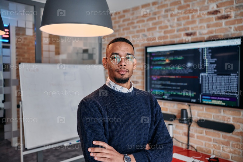 Лидерство в стартапе: афроамериканский бизнесмен в современном офисе с коллегами на заднем плане