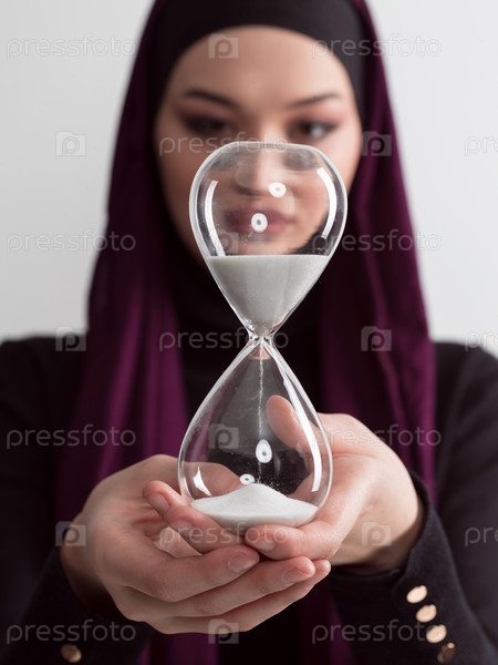 Красивая арабская бизнесвумен в хиджабе и держит песочные часы. Время идет, и это концепция давления