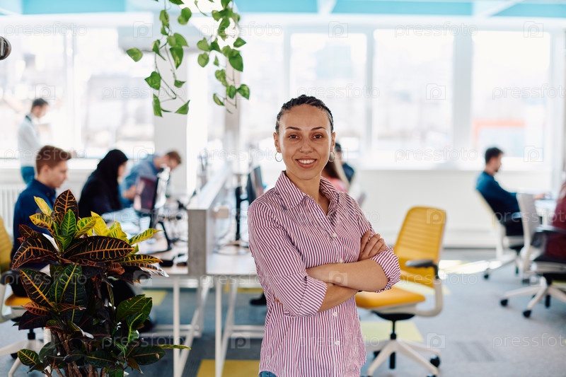 Портрет молодой улыбающейся деловой женщины в креативном открытом пространстве коворкинга стартап-офиса. Успешная бизнес-леди стоит в офисе с копирайтом. Коллеги, работающие на заднем плане