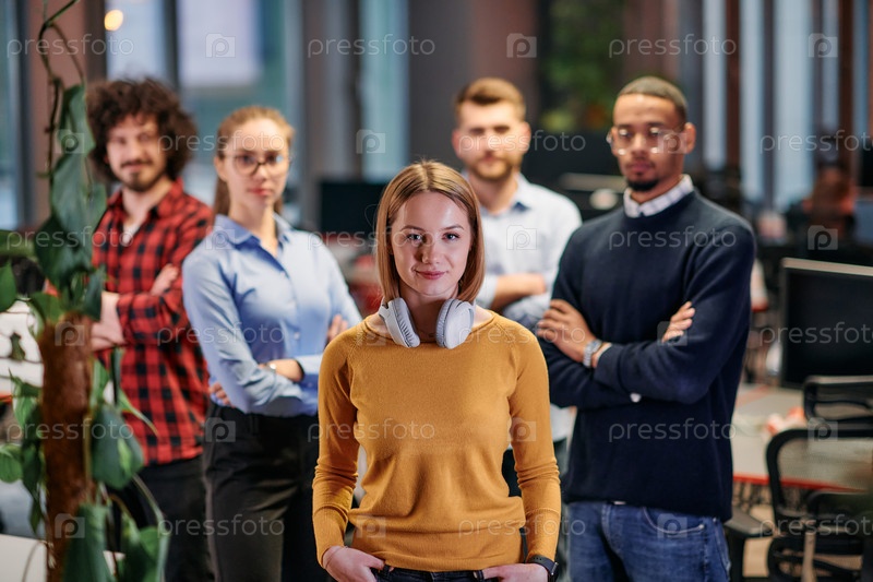 Портрет успешной творческой бизнес-команды, смотрящей в камеру и улыбающейся. Разнообразные деловые люди, стоящие вместе на старте. Избирательный фокус