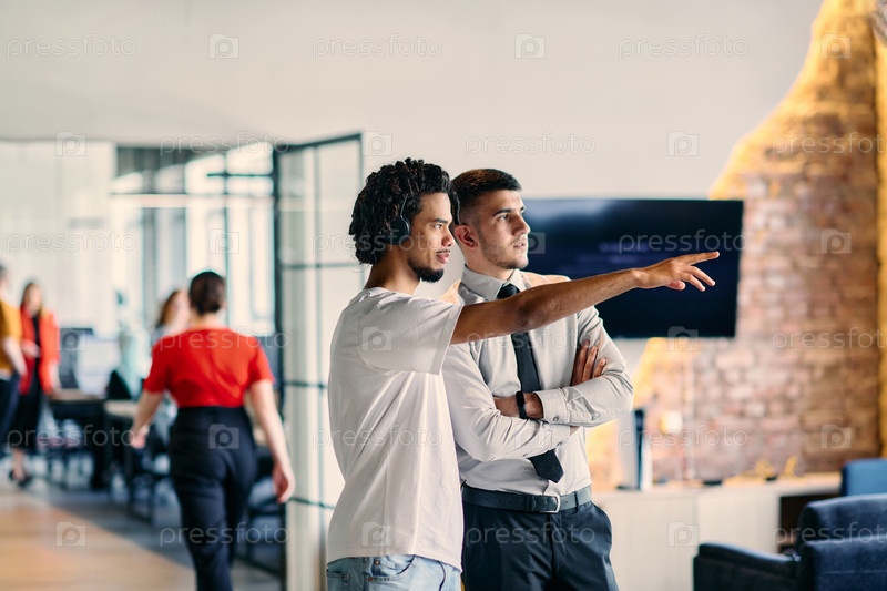 Группа коллег, включая афроамериканского бизнесмена и молодого лидера в рубашке и галстуке, позируют вместе в современном офисе коворкинг-центра, представляя собой динамичное сочетание профессионализма и сотрудничества