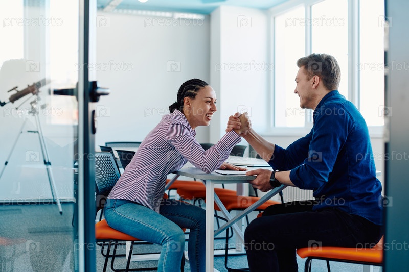 В современном офисе стартапа бизнесмен и его коллеги по бизнесу устраивают символический поединок по армрестлингу, отражающий командную работу, конкуренцию и инновации в их динамичном рабочем пространстве
