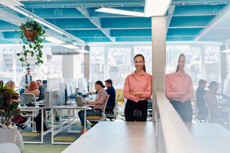 Портрет молодой улыбающейся деловой женщины в креативном открытом пространстве коворкинга стартап-офиса. Успешная бизнес-леди стоит в офисе с копирайтом. Коллеги, работающие на заднем плане