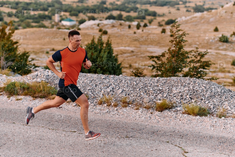 Решительный спортсмен бежит по пересеченной горной местности на рассвете