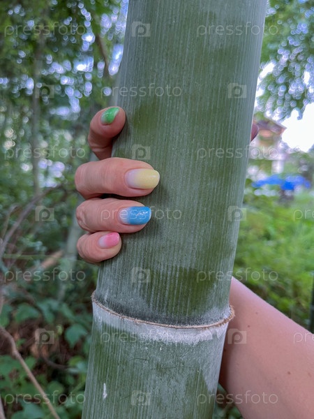 Фото женской руки с разноцветными ногтями под гель-лаком в Грузии, в бамбуковой роще