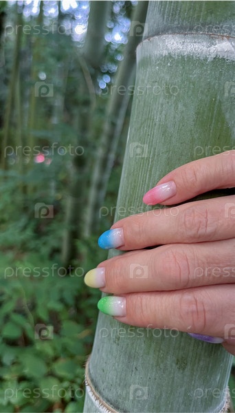 Фото женской руки с разноцветными ногтями под гель-лаком в Грузии, в бамбуковой роще