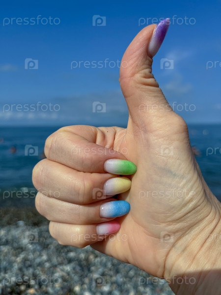 Фото женской руки с разноцветными ногтями под гель-лаком на фоне галечного пляжа
