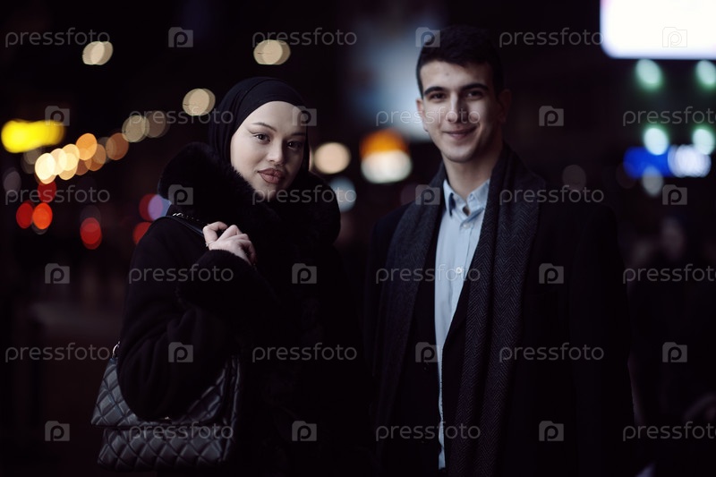 Счастливая мультикультурная деловая пара прогуливается вместе на улице города ночью возле витрины ювелирного магазина