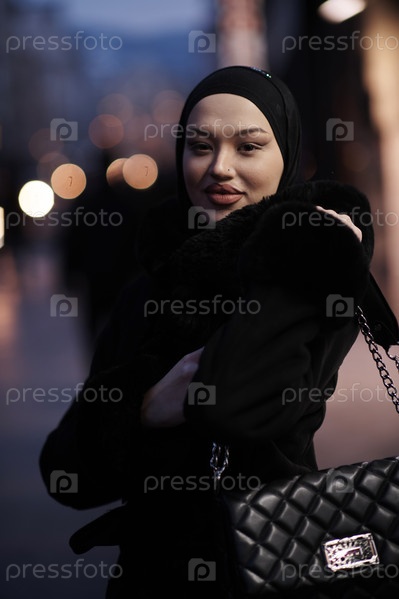 Мусульманка идет по городской улице холодной зимней ночью в хиджабе