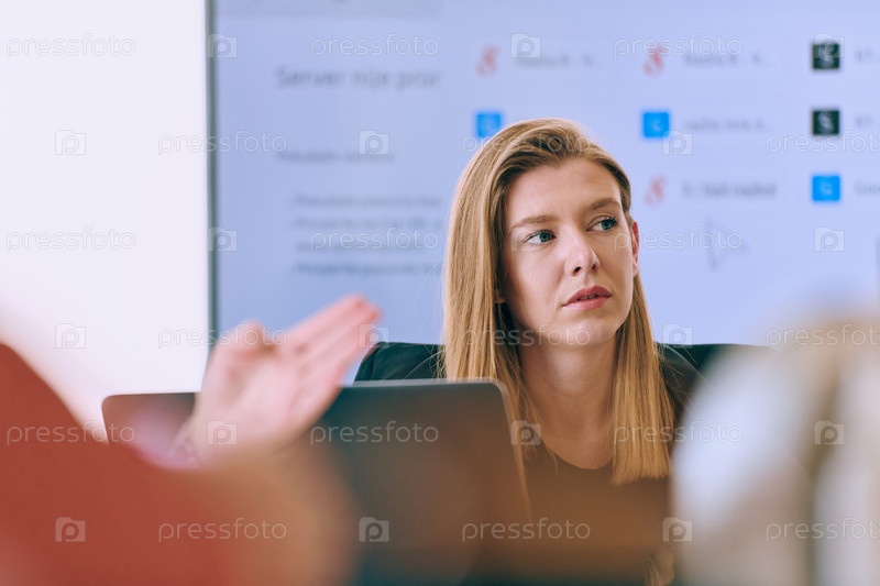 Профессиональная бизнес-леди проводит интересную встречу с коллегами: портрет
