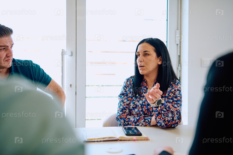 Разнообразная бизнес-группа обсуждает проекты в современном стеклянном офисе